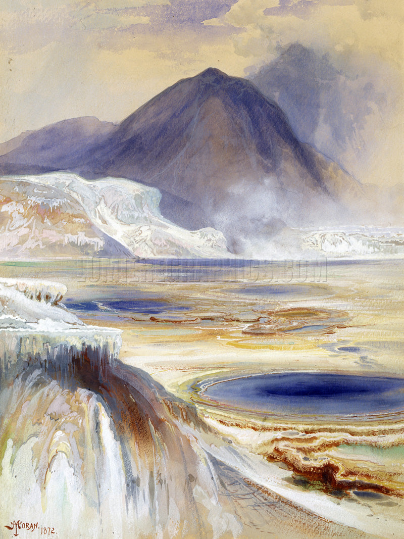 This painting was made with watercolor and pencil on paper and was created in 1872 by American painter and printmaker Thomas Moran (1837-1926). This area was explored during the 1871 Hayden Expedition in 1871, which included artist Thomas Moran and photographer William Henry Jackson. The painting was created during that time. (Smithsonian)