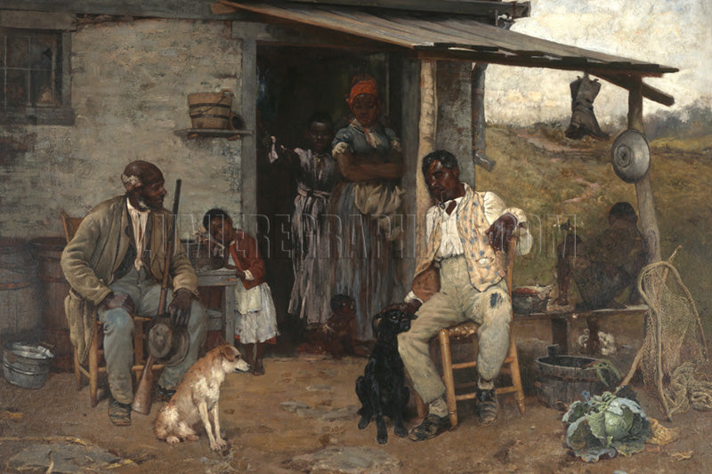 This oil-on-canvas painting was created in 1881 by American artist Richard Norris Brooke (1847-1920). Known for his scenes featuring African-American people, Brooke painted this scene of two friends sitting outside together while trading dogs. Other family members are part of the scene. (Smithsonian)