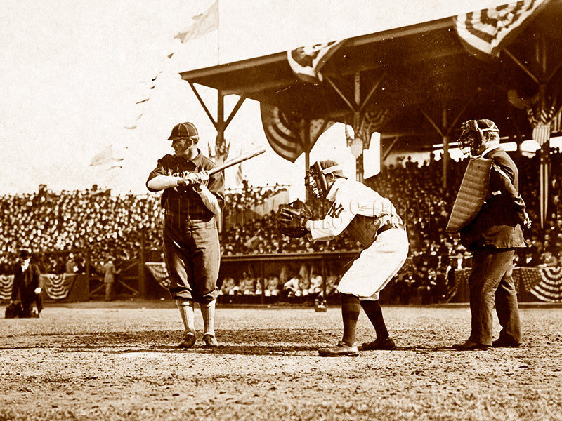 This photograph shows Washington AL baseball player Otis Edger Clymer (1876-1926) at bat with New York AL player John Peter “Red” Kleinow (1877–1929) catching. Clymer usually played right field in his six-season career with four teams: the Washington Senators, Pittsburgh Pirates, Chicago Cubs, and Boston Braves. The photograph was published in 1909.