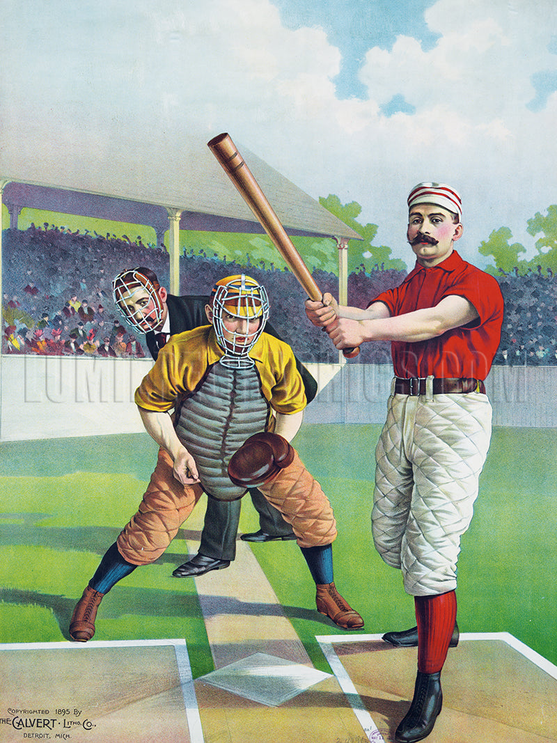 This full-sheet advertising poster shows a baseball player at bat, poised in front of a catcher and umpire with the grandstand behind them. At the time, posters of this kind were used to advertise games, promote baseball cards and other sports memorabilia, illustrate magazines and newspapers, etc. The photograph was published ca. 1895 by the Calvert Litho. Co.