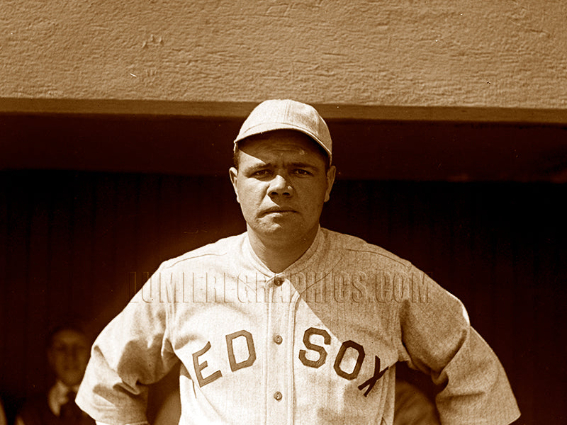 This photograph shows baseball hitter and pitcher George Herman "Babe" Ruth (1895–1948) standing outside the Boston Red Sox dugout during his last season with the team. That year, he led the league in home runs (29), RBIs (113), and runs scored (103). This photograph was created in 1919.