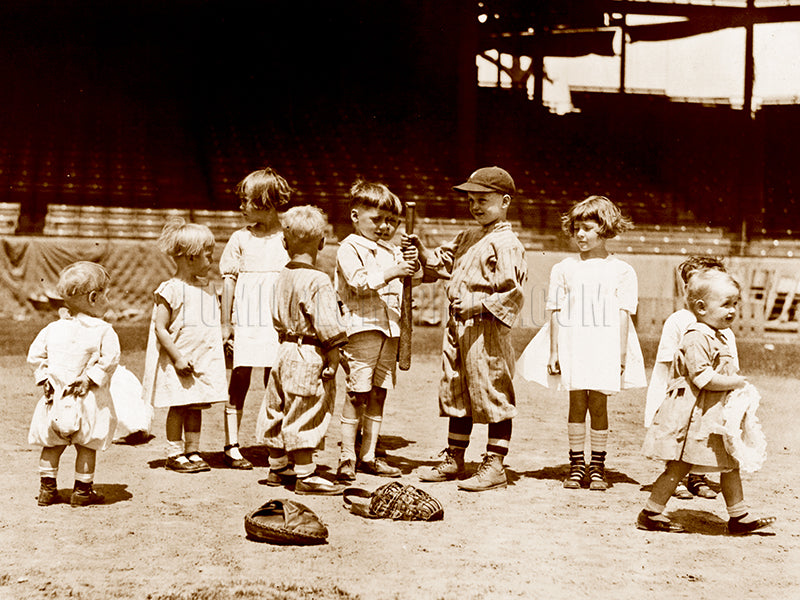This photograph shows young girls and boys on a baseball field at a Major League Baseball stadium. Children loved baseball in the 1920s. Babe Ruth was seen as a national icon at this time and inspired many young fans to love the sport. The photograph was published ca. 1920.