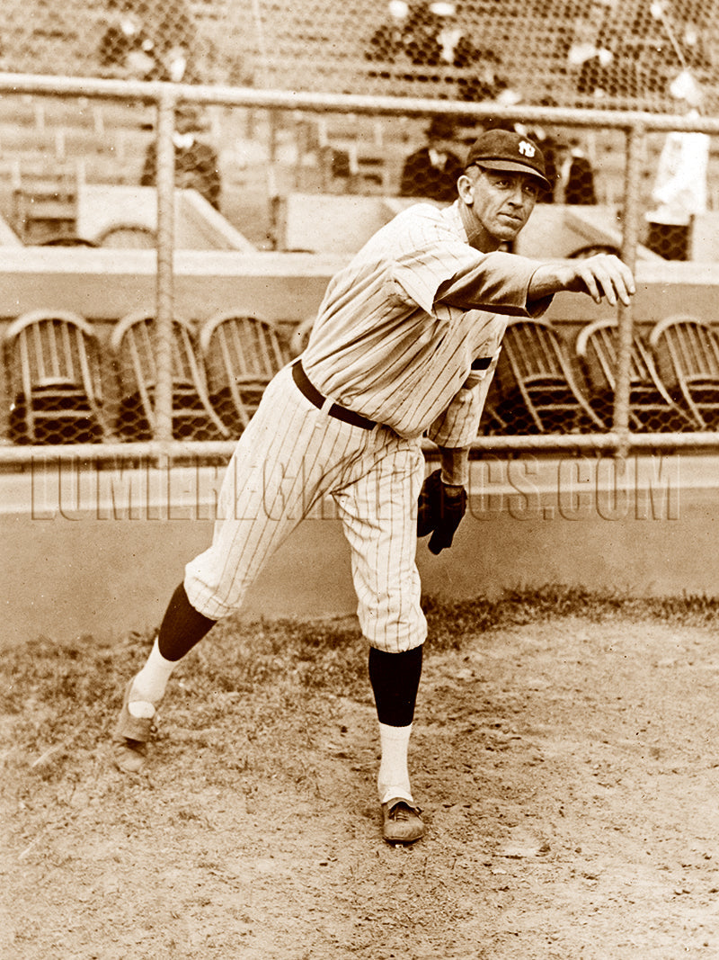This photograph shows New York Yankees pitcher Raymond Benjamin Caldwell (1888-1967) with his right arm extended after pitching the ball. He was one of the last pitchers allowed to use the spitball. Amazingly, he went on to win a game even after being struck by lightning during the ninth inning of a game in 1918. The photograph was published in 1918.
