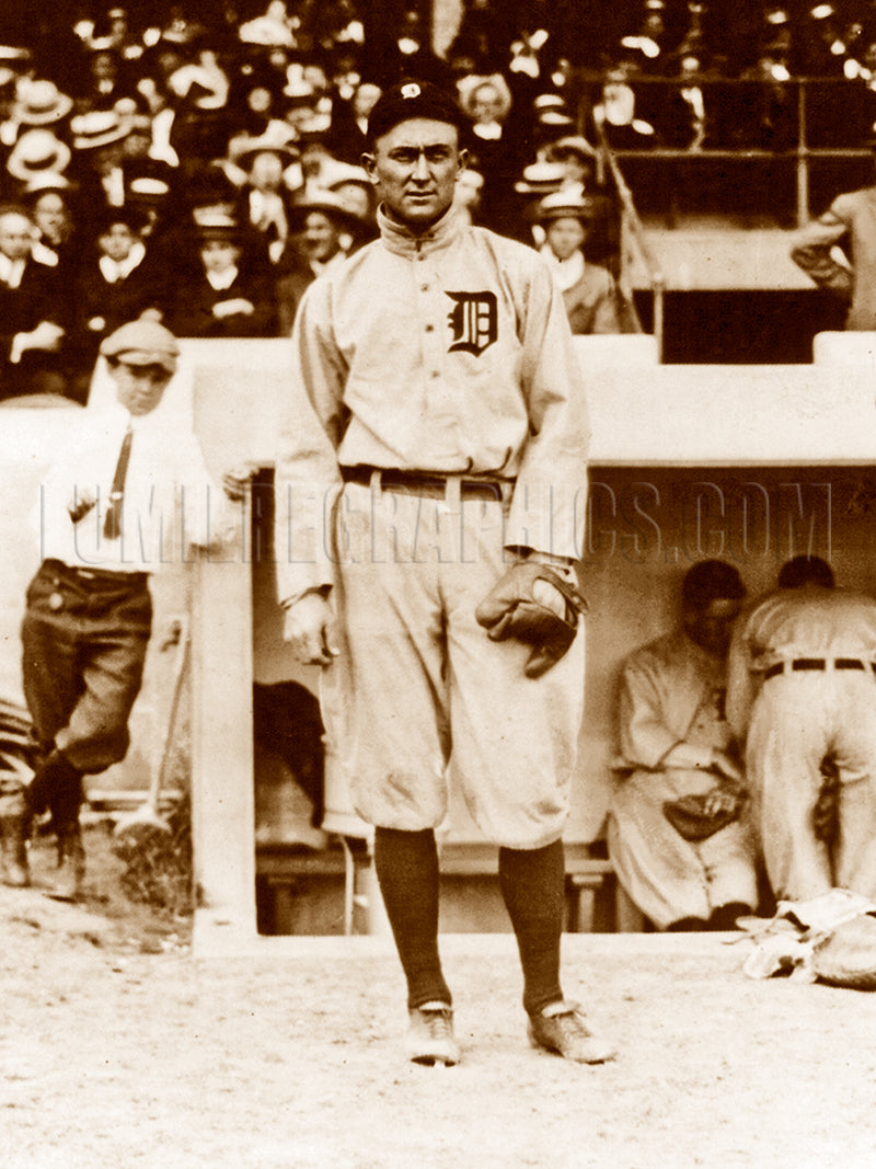 This photograph shows Detroit Tigers player Tyrus Raymond “Georgia Peach” Cobb (1886-1961) standing in front of the dugout. Cobb led the American League in numerous categories, including doubles, triples, and stolen bases. He was feared for his ruthless nature and revered for his legendary talent. The photograph was published in 1914.