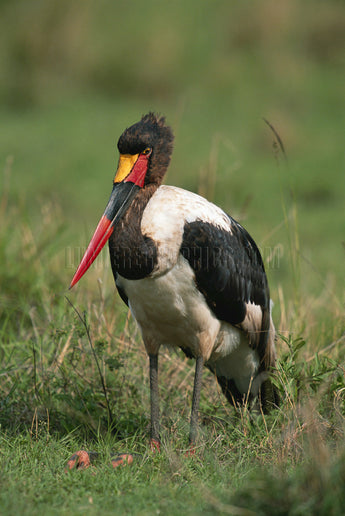 The saddle-billed stork is the largest stork in Africa, standing about 5 feet tall, with a wingspan of 7-8 feet. They are carnivorous and mostly eat fish, frogs, and other aquatic animals. When on the hunt, they wade through shallow water and stab their prey with their sharp bills.