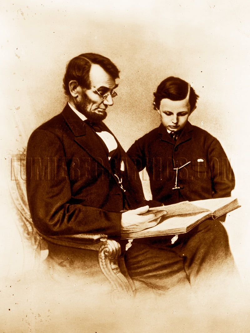 This poignant photograph shows 16th President Abraham Lincoln (1809-1865) reading with his son, Thomas. The youngest of four, "Tad," lived only to the age of 18, dying six years after his father was assassinated by John Wilkes Booth.