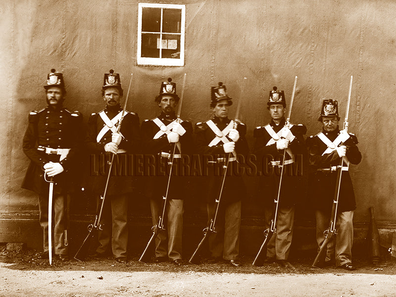 Standing with fixed bayonets are six marines. The marines took part in the Federal Navy seaborne expeditions against the Atlantic Coast of the Confederacy.