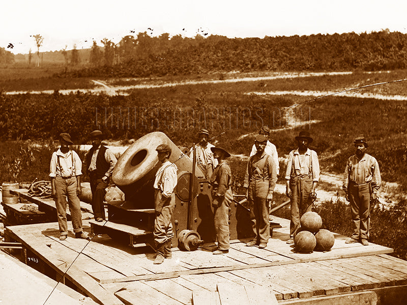 Soldiers stand next to a large cannon mounted on a small railroad flatcar in front of Petersburg, Virginia. Short, stubby mortars like “The Dictator,” a famous weapon of the Civil War, fired heavy shells in a high arc. These explosive shots could weigh as much as 200 pounds and scattered 10- to 20-pound fragments on their targets at high speeds.