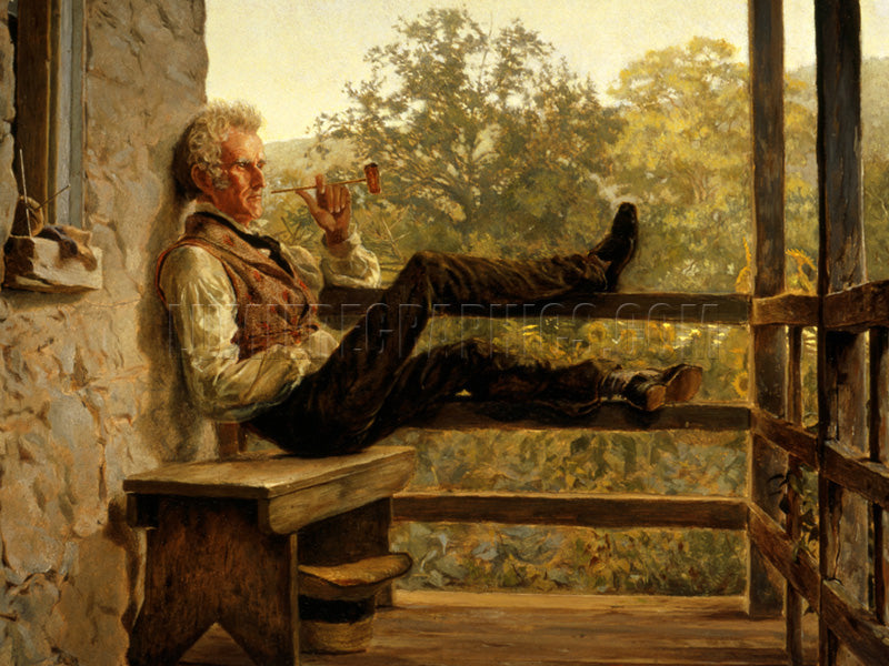 This oil painting was created on paperboard by American genre painter Frank Blackwell Mayer (1827-1899) in 1858. The portrait shows Jack Porter, a veteran of the War of 1812, who later earned a good living from Pennsylvania’s coal mines. He is posed at leisure, sitting on a bench and smoking a corncob pipe. His wife’s knitting sets on the windowsill beside him. (Smithsonian)