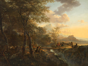 This oil-on-canvas painting was created ca. 1650 by Dutch painter, draftsman, and etcher Jan Both (1618-1652). Various people are painted near the waterfall. Note the wealthy traveler in a sedan chair, with mules carrying the luggage. This painting was created at home in Both’s studio. (Rijksmuseum)
