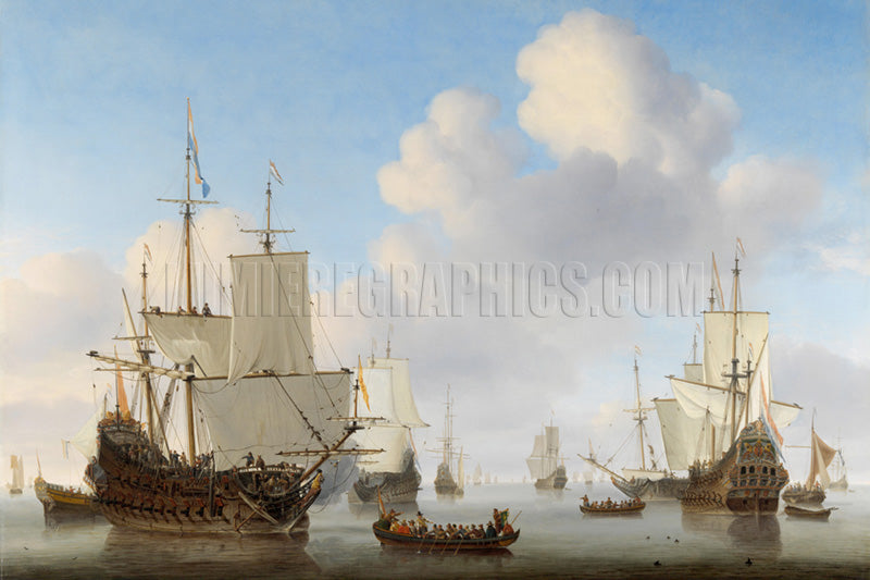 This oil-on-canvas painting was created by Dutch marine painter Willem van de Velde II (1633-1707) ca. 1665. It shows warships in a calm sea, with hoisted sails and raised anchors. The small squadron is leaving, as a sloop with dignitaries rows past the ships. (Rijksmuseum)
