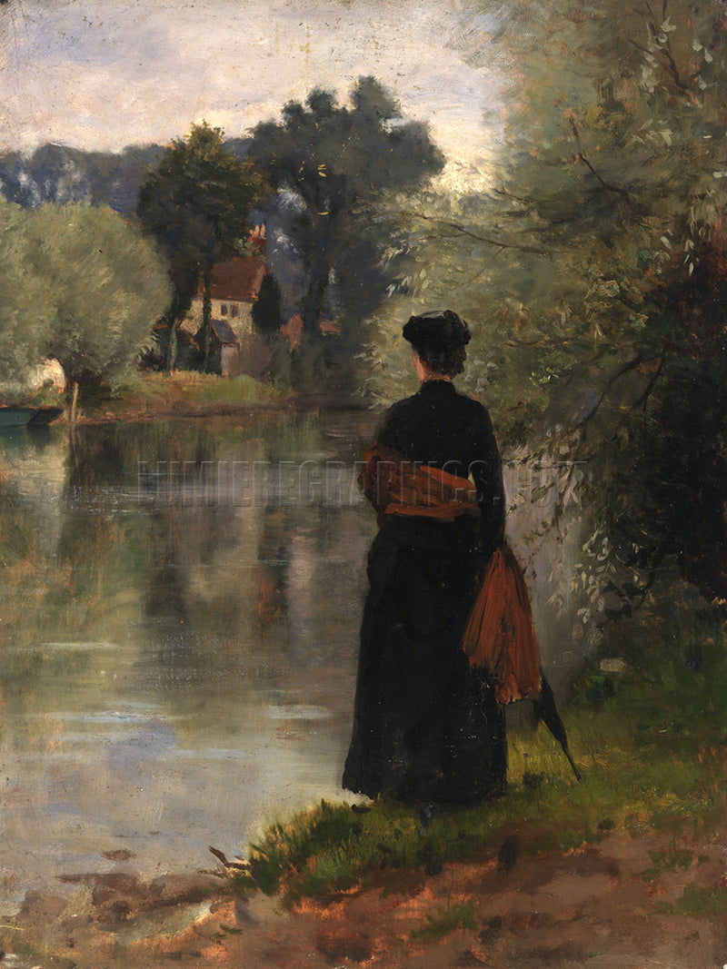 This small, undated oil-on-canvas painting was created by American painter Eliphalet Fraser Andrews (1835-1915). Andrews was primarily known as a portrait artist, although this painting features a woman on a stroll by a river. (Smithsonian)