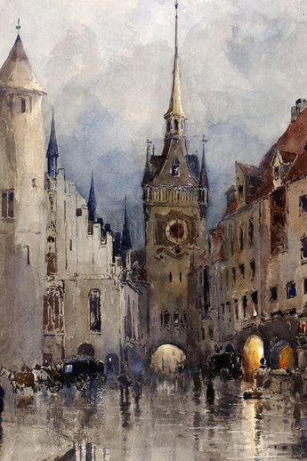 This watercolor-and-pencil painting was created on paper in 1880 by American painter and educator Ross Turner (1847-1915). Known for his impressionist style, he painted this delicate watercolor to show a bustling old European street scene with shop lights reflecting on the rain-covered pavement. (Smithsonian)
