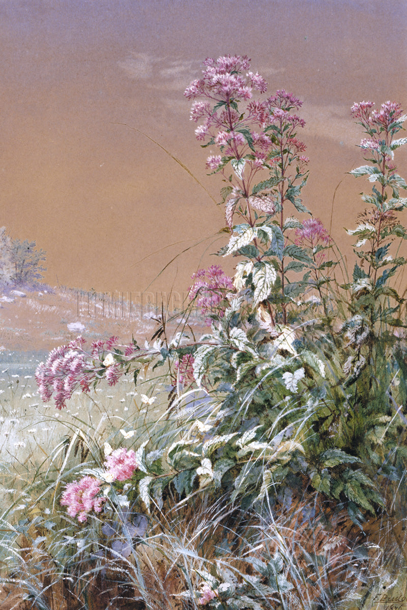 This undated and untitled watercolor painting was created on paper by American artist Fidelia Bridges (1834-1923). Although she began her career painting with oils, she is best known for her delicate watercolor paintings of flowers, plants, and birds. (Smithsonian)