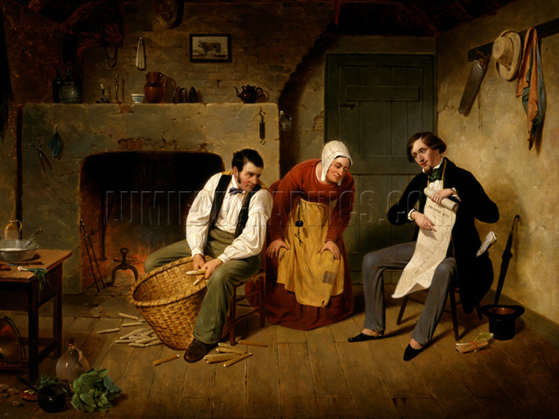 This oil-on-canvas painting was created in 1852 by American genre painter Francis William Edmonds (1806-1863). The painting shows a rural couple listening to a salesman, a representative of the Building Association. His appearance, that of a sweet-talking city slicker, appears to make the couple skeptical of his promises. (Smithsonian)