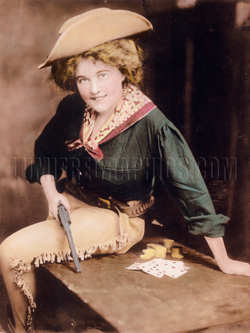 The woman in this photograph is identified as Kitty Leroy, a well-known figure of the American Old West. The photograph shows her in typical "cowgirl" attire, complete with a hat, a bandana, a revolver, playing cards, and chips—all part of her life as a frontierswoman and gambler. She was known for her sharp shooting skills and often performed in Wild West shows, much like another famous frontierswoman, Calamity Jane. Hand tinted by Stanley R. Waine.