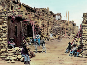 These Hopi children on burros are from the Mishongnovi village (pueblo) on Second Mesa, Arizona. The Anasazi were the prehistoric ancestors of the Hopi. The Hopi have lived in the Southwest for more than 2,000 years. Their traditional dwellings are built of stone. Photographed in 1918, photographer unknown; hand tinted by Stanley R. Waine.