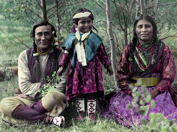 Sampson, Frances Louise and Leah Beaver, a Blackfoot family, lived in a poplar grove along the Saskatchewan River in the Canadian Rockies. The photographer visited the family frequently; they became great friends. Note the family's attire, a combination of traditional and trade clothing. Photographed in 1907 by Mary T. S. Schaffer, hand tinted by Stanley R. Waine.