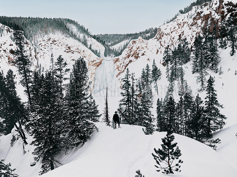 Red Rock Point offers Ed Wilson, a well-known civilian scout for the U.S. Army, a spectacular winter view of the Lower Falls cascading into Yellowstone’s Grand Canyon. Red Rock point is on the north rim of the canyon, a 500-foot trek downward from Lookout Point. Photographed in 1887 by F. Jay Haynes, hand tinted by Stanley R. Waine.