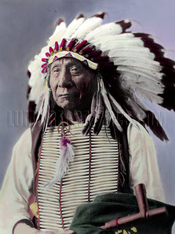 Mahpiua Luta, Red Cloud, was a famed chief of the Oglala Sioux. He fought fiercely in the 1860's to retain rights to hunting lands along the Powder River. He later ceased fighting, fearing more his people's extinction. Photographed by David F. Barry ca. 1905, hand tinted by Stanley R. Waine.