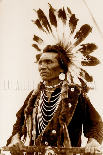 Chief Eagle is wearing a headdress of eagle feathers. In particular, the feathers of the Golden Eagle were highly prized. A complete tail of 12 eagle feathers could be traded for a pony. Photographed ca. 1910 by Edward H. Boos.