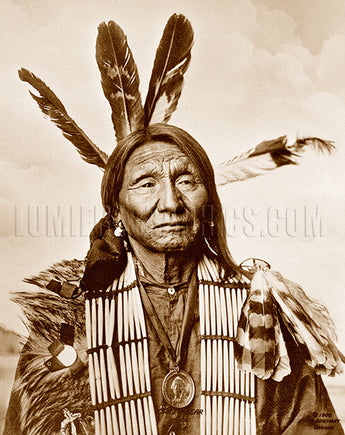 This elderly man is identified as a Lakota Sioux chief named Crazy Bear. He was a member of the tribal council that also brought Crazy Horse to leadership. Note his magnificent hair-pipe necklace; hair- pipes are made from the lower leg bones of animals.