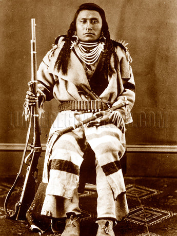 Little Wolf poses wearing a wool trade blanket cut into a coat. He holds a tomahawk in one hand, a .52-caliber Sharps New Model 1859 Carbine in the other. Photographed ca. 1885 by H.B. Calfee.