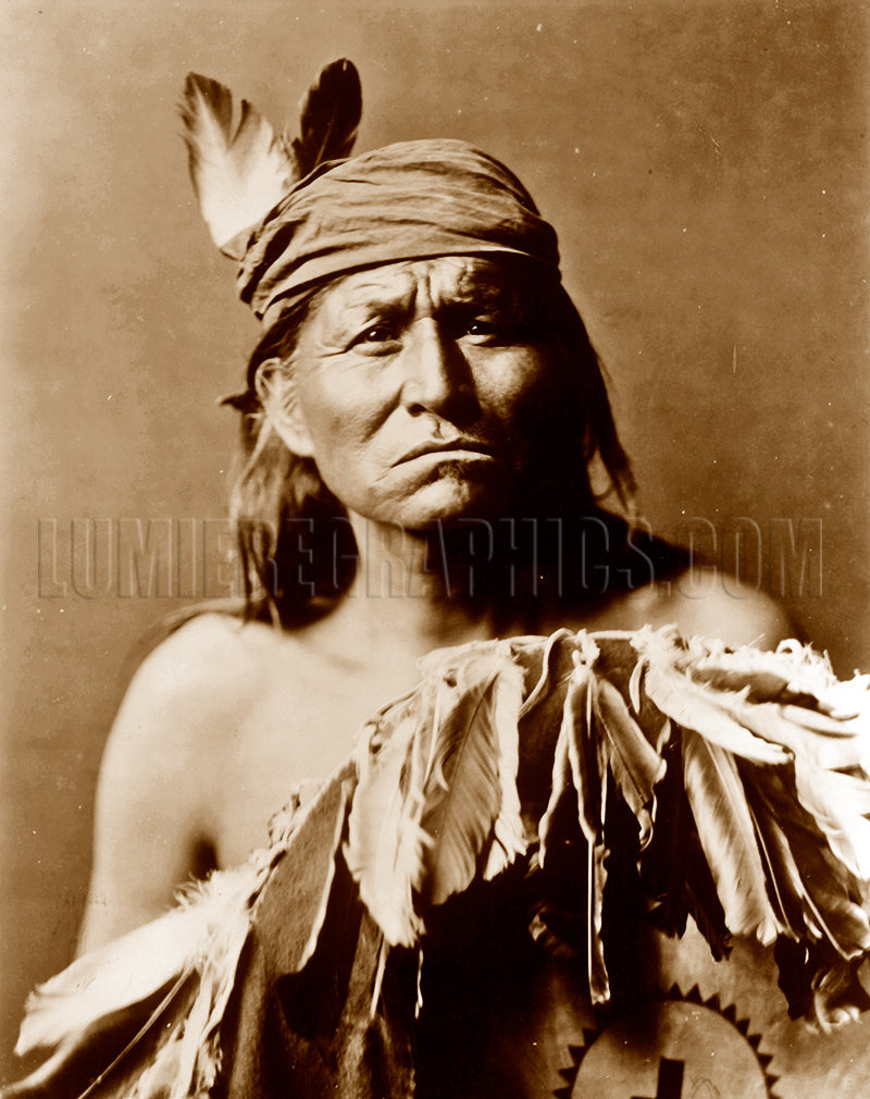 Because of his bare shoulders, this Apache tribesman is thought to live in a desert region of the Southwest. His war shield is rimmed with feathers, probably eagle. Photographed in 1903 by Edward S. Curtis