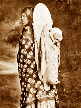 The baby is securely laced into the cradleboard. Sometimes fragrant herbs and weeds were place inside, and a toy or rattle might be permanently affixed to entertain the baby. Photographed ca. 1925 by T. J. Hileman (955-490).