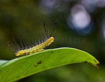 Fall webworms are usually pale yellow or green with black spots and long, white hairs. They eat the leaves of fruit, nut, and ornamental trees. They build large, silky white webs around the leaves they eat, commonly seen in late summer in North America.