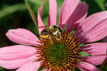 This leafcutter bee is collecting pollen and nectar from a Purple Coneflower. Their name comes from how they cut round or crescent-shaped pieces of leaves and flower petals, then drag the discs back to their nests to protect their eggs and store pollen.