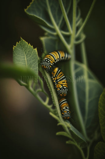 This photo shows several Monarch butterfly caterpillars on a milkweed plant, their preferred food. The ingestion of the toxic milkweed plants makes them poisonous for predators. As they grow, they will go through five stages before forming a chrysalis and becoming a butterfly. The North American Monarch butterfly is one of the most beloved natural phenomena in the world.