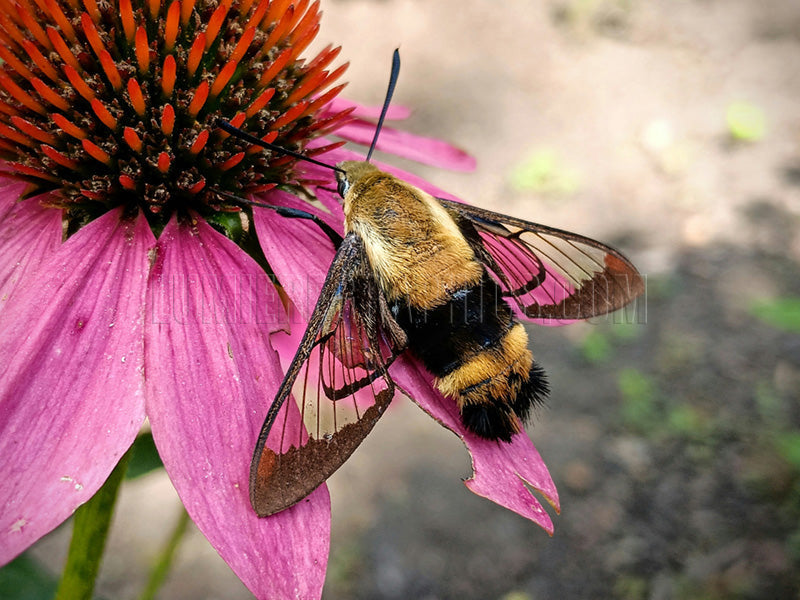 This Snowberry Clearwing moth, also known as a hummingbird moth or bumblebee moth, is feeding on a purple coneflower. These harmless moths pretend to be bumblebees when they feel threatened.