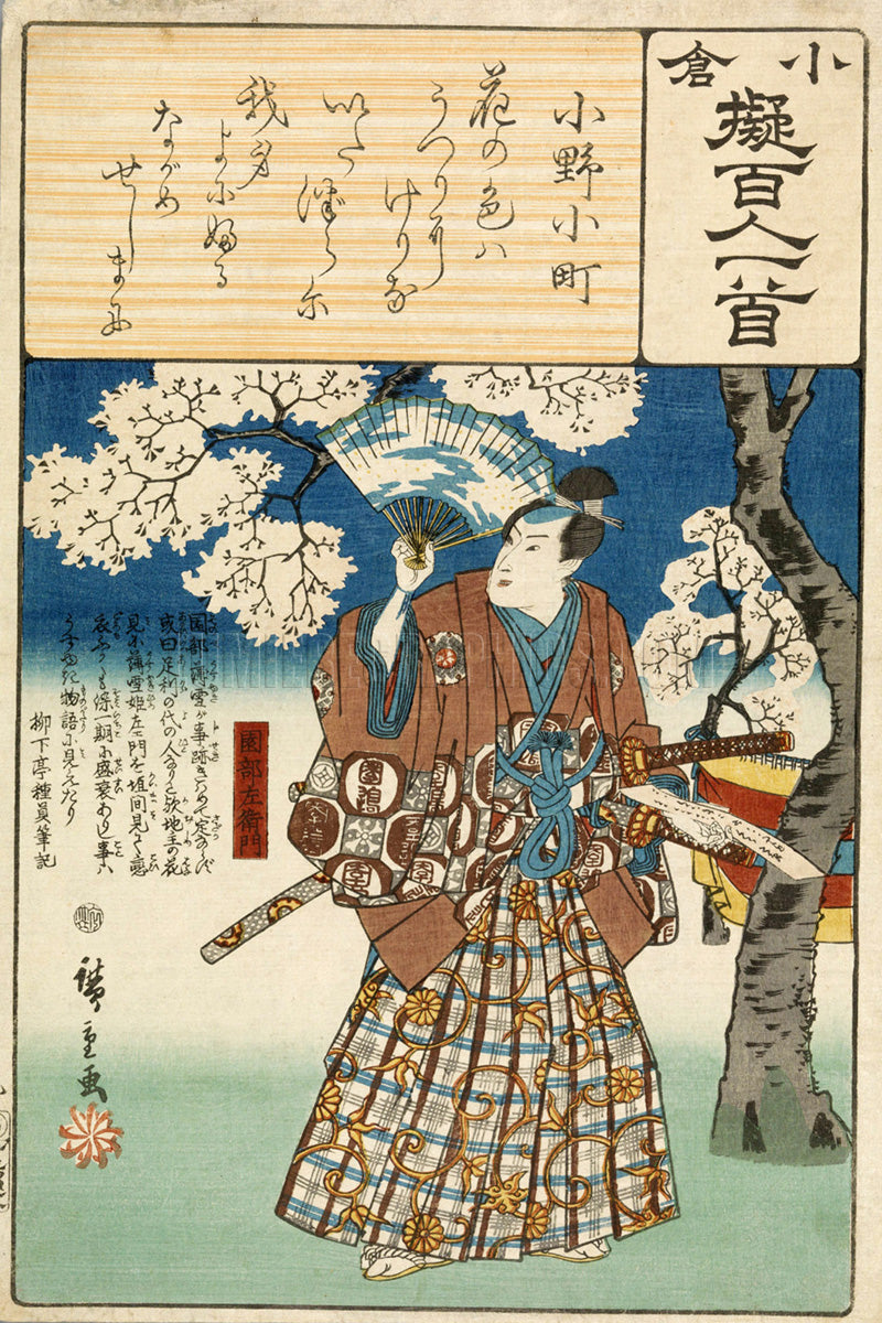 This woodblock print shows the famous ninth-century Japanese poet Ono no Komachi. "Sonobe Saemon" is the title of one of his poems. The image is from the series, “Ogura Imitations of One Hundred Poems by One Hundred Poets.” It was created ca. 1847 by Japanese artist Utagawa Hiroshige (1797-1858), considered the last great master of ukiyo-e art or woodblock print. (From the collection of the Rijks Museum, Amsterdam)