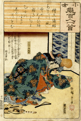 This woodblock print illustrates a poem by poet Sōjō Henjō about the famous dancer, Hotoke Goen. It is from the series, “Ogura Imitations of One Hundred Poems by One Hundred Poets.” It was created ca. 1847 by Japanese artist Utagawa Hiroshige (1797-1858), considered the last great master of ukiyo-e art or woodblock print. (From the collection of the Rijks Museum, Amsterdam)