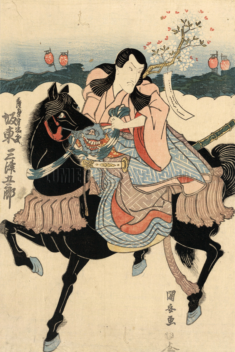The title translates to “The Actor Bandō Mitsugorō in the Role of Satsumanokami Tadanori.” This woodblock print shows the actor Bandō Mitsugorō, one of Japan's most beloved kabuki actors, on a horse. The woodcut was created (with color) ca. 1825 by Japanese ukiyo-e artist Kuniyasu Utagawa (1794-1832). (Library of Congress, LC-DIG-jpd-00251)