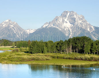 This beautiful view shows a bend in the Snake River called Oxbow Bend, a popular spot in Grand Teton National Park (Wyoming). The 12,605-foot-tall Mount Moran, a striking peak in the Teton Range, is reflected in the Snake River.