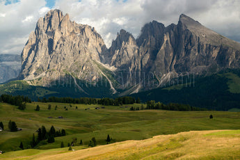 This beautiful landscape shows Alpe di Siusi (Seiser Alm), the largest,high-elevation alpine meadow in Europe. It is located in the Italian Dolomites, a mountain range located in the Eastern Alps of northern Italy. The prominent mountain peaks in the background are the Sassolungo (Langkofel) and Sasso Piatto (Plattkofel) mountain ranges.