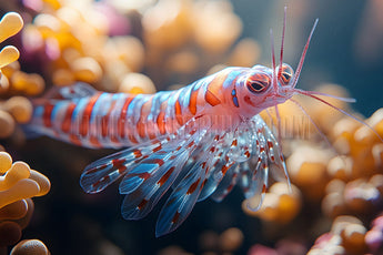 This shrimp, swimming through a coral reef, may be a “cleaner shrimp.” These small crustaceans live in coral reefs where they spend their time removing parasites, dead skin, and mucous from larger fish. Win-win—the shrimps are fed and the larger fish are healthy!