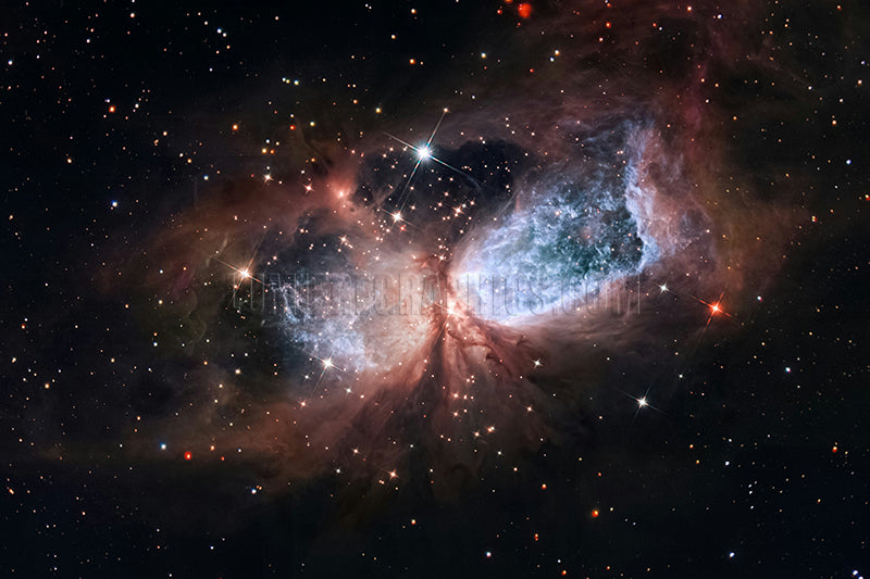 The Sharpless 2-106 nebula is also known as the "Celestial Snow Angel,” “Angel Nebula,” Hourglass Nebula,” or Christmas Angel Nebula.” It is located in the constellation Cygnus, about 2,000 light-years from Earth. Its hourglass shape is caused by powerful jets of hot gas that come from its new central star. A circlet of cooler dust acts as a “belt.”