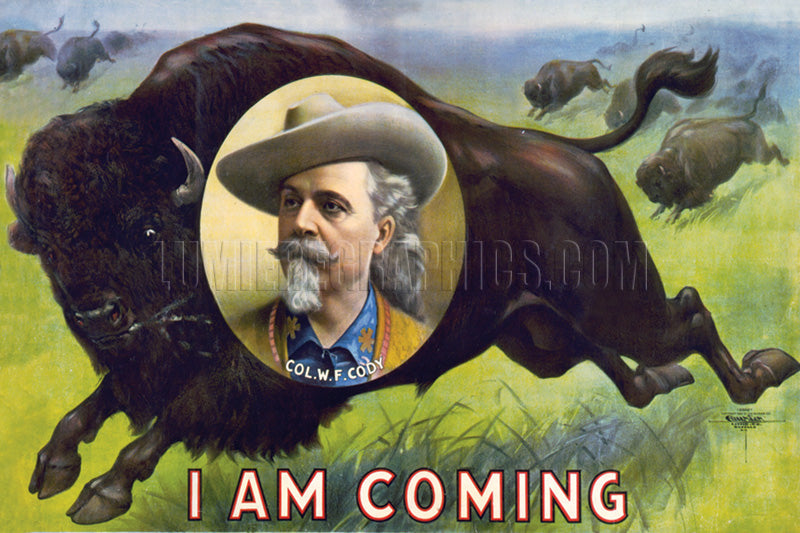This poster with the phrase “I AM COMING” printed below William F. Cody’s portrait was a promotional piece for his famous Buffalo Bill’s Wild West show. The posters were distributed before the show came to a town to drum up business for a spectacular performance about to launch. This color lithograph was published ca. 1900 (LC-DIG-ppmsca-54877).