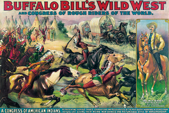 This show poster was a promotional piece for William F. Cody’s famous Buffalo Bill’s Wild West show. It shows a group of American Indians leading an attack against pioneers in covered wagons as they traveled westward. The portrait in the right margin of the poster is of Buffalo Bill on horseback. This color lithograph was published ca. 1899 by the Courier Litho. Co. (LC-DIG-ppmsca-54873).