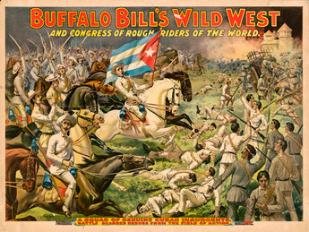 This show poster was a promotional piece for William F. Cody’s famous Buffalo Bill’s Wild West show. It shows a battle between Buffalo Bill’s "Congress of Rough Riders of the World" (a performance group) and a squad of genuine Cuban insurgents. This color lithograph was published ca. 1898 by the Courier Litho. Co. (LC-DIG-ppmsca-54869).