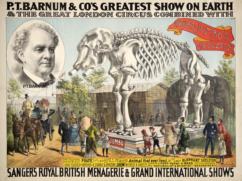 This promotional poster announced an event where the Barnum & Bailey Greatest Show on Earth combined with The Great London Circus as well as Sangers Royal British Menagerie & Grand International Shows. It shows the “Great Jumbo’s Skeleton,” the remains of an elephant who died about this time. Barnum donated the skeleton to the American Museum of Natural History in 1889, where it remains on display today. The cameo portrait is of P.T. Barnum. This chromolithograph was published ca. 1885 by Strobridge & Co. (LC-DIG-ppmsca-32620).