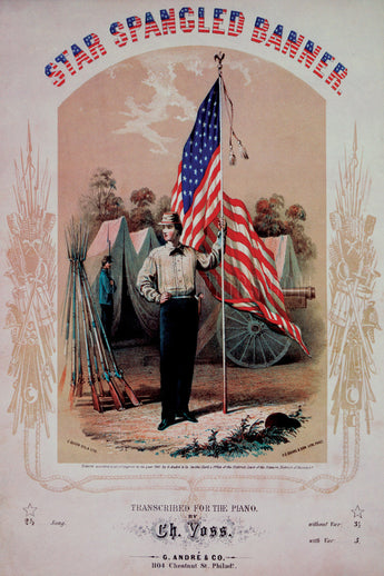 This cover for the sheet music of the “Star Spangled Banner” was drawn by the famed Philadelphia lithographer James F. Queen (1820-1886). It shows a Union soldier proudly holding an American flag at a military camp. Behind are tents, a cannon, and rifles. This chromolithograph was published ca. 1861 by G. Andre & Co. (LC-DIG-pga-10370 ).