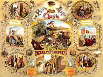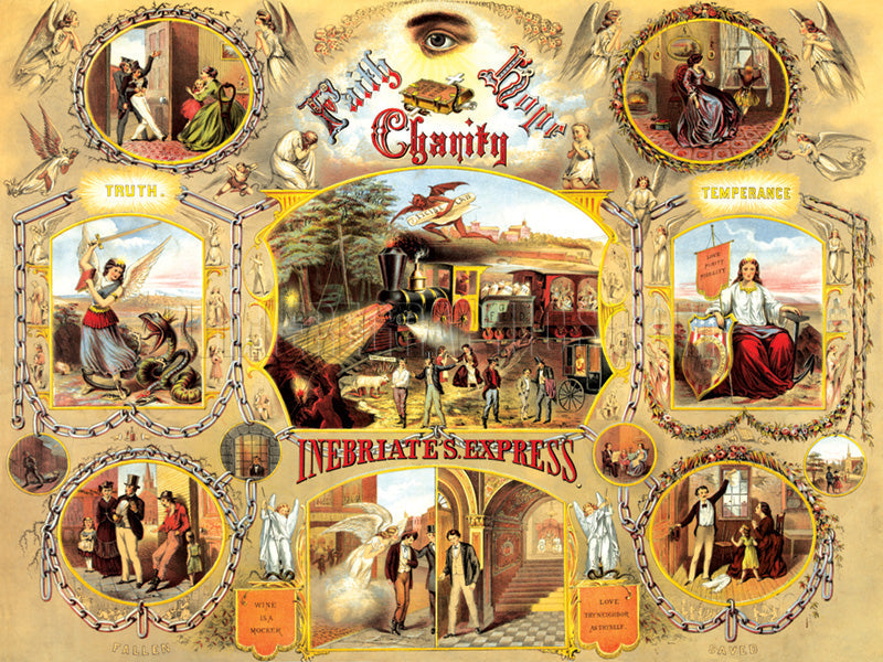 This Temperance Movement poster is subtitled “Inebriate’s Express” since all of the scenes relate to temperance and sobriety, with several intended to raise awareness of the negative effects of alcohol abuse. This color lithograph was published ca. 1870 by the N.Y. Lithographing, Engraving& Printing Co. (LC-DIG-pga-02286).