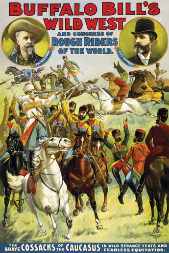 This show poster was a promotional piece for William F. Cody’s famous Buffalo Bill’s Wild West show. It shows a group of Cossacks in battle on horseback, although in the actual show they performed warlike acts of horsemanship rather than acts of battle. The portraits feature William F. "Buffalo Bill" Cody and Nate Salsbury, his primary business partner. This color lithograph was published ca. 1899 by the Courier Litho. Co. (LC-DIG-ppmsca-54871).