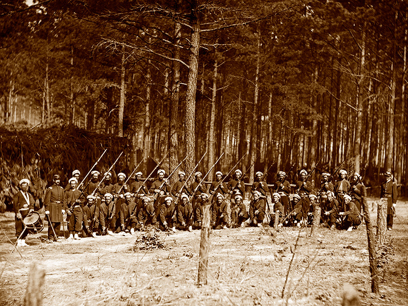 Gathered in Petersburg, Virginia, Company F of the 114th Pennsylvania Infantry posed holding fixed bayonets. The company was recruited in Philadelphia in August 1861 and was known as the Zouaves D’ Afrique. Most of the men had previously served in European armies.